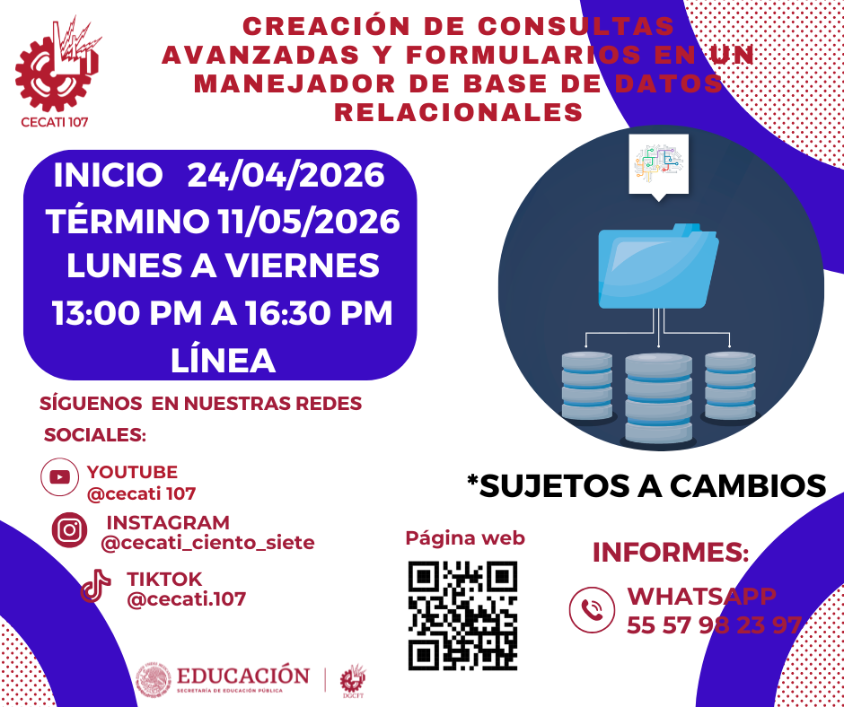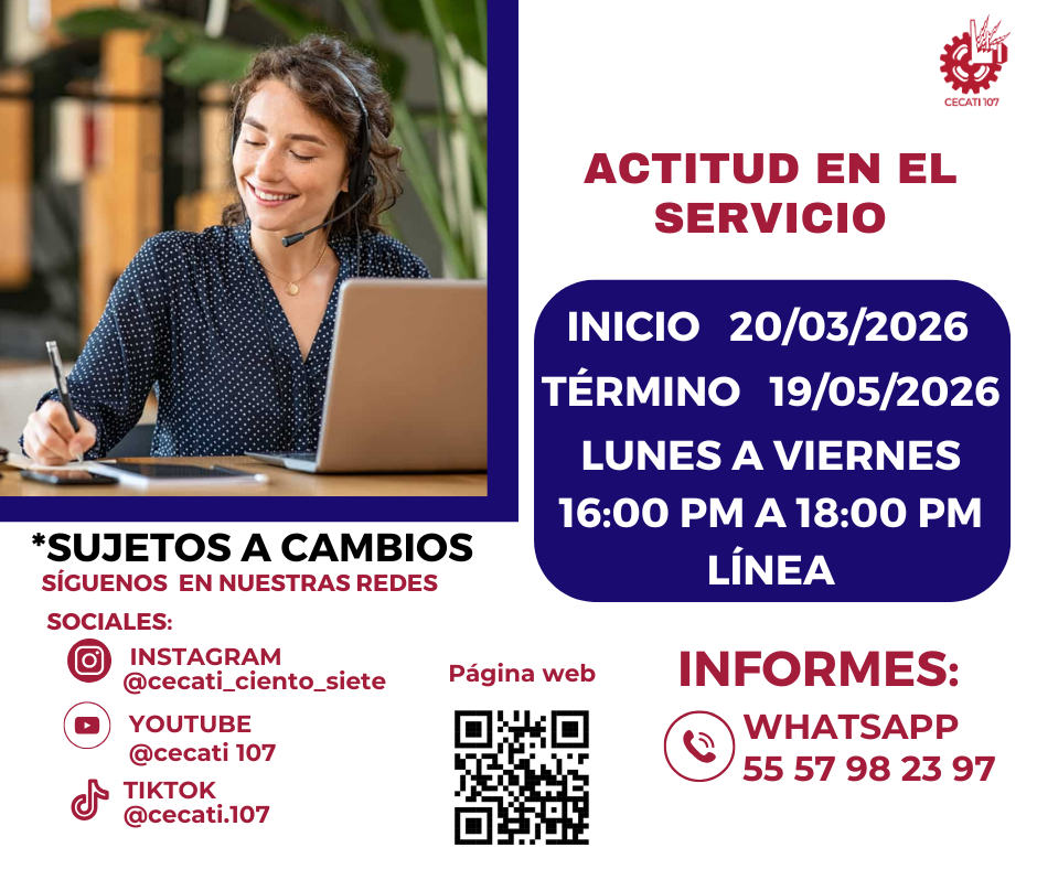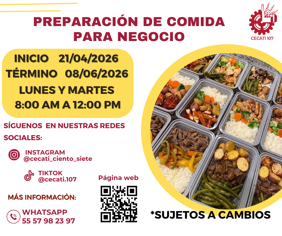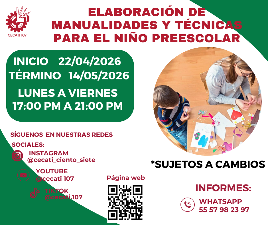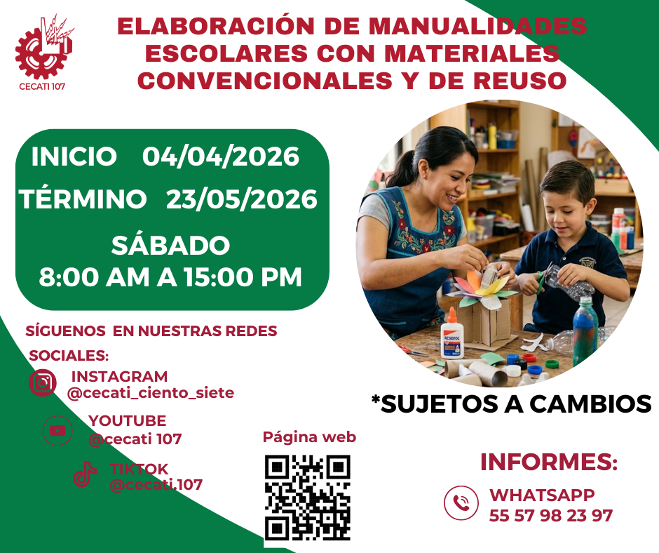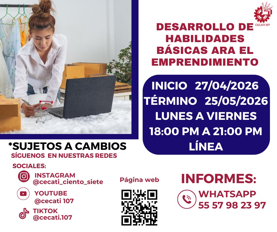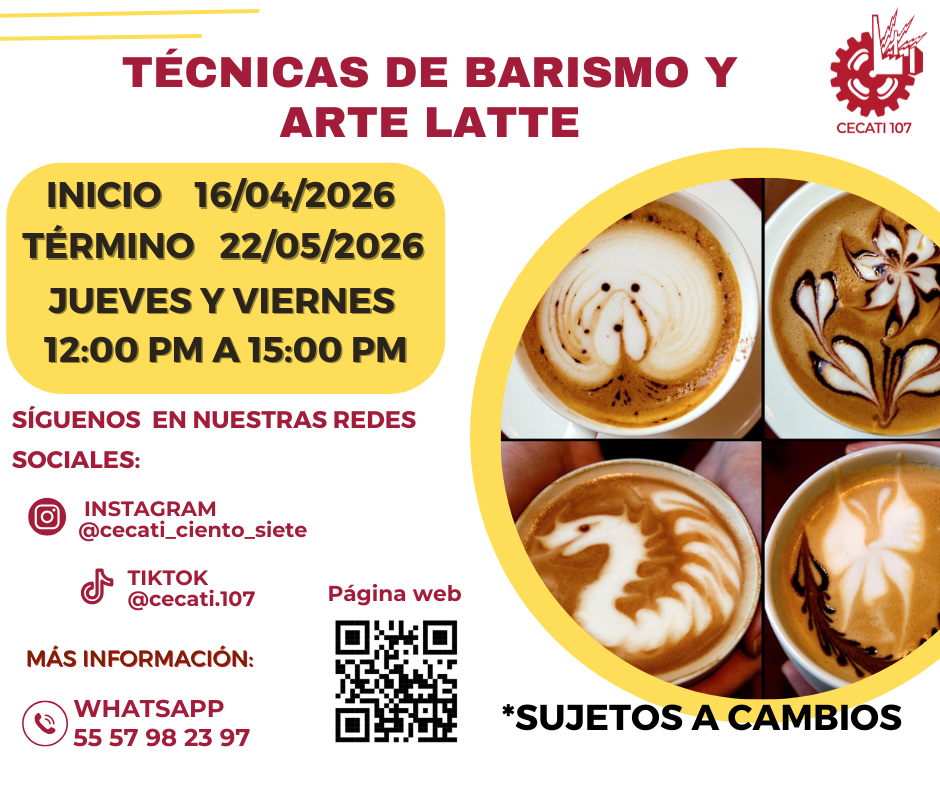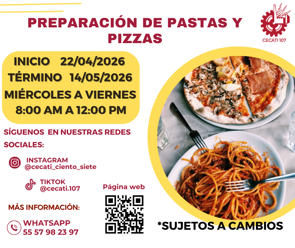 CURSOS DE ABRIL 2026 Alimentos y Bebidas TÉCNICAS DE PREPARACIÓN DE PASTAS Y SALSASTÉCNICAS DE BARISMO Y ARTE LATTE PREPARACION DE PLATILLOS CASEROS PREPARACIÓN DE COMIDA PARA NEGOCIO PREPARACIÓN DE PASTAS Y PIZZAS PREPARACIÓN DE MUFFIN Y PANQUE ARTESANAL Informática DESARROLLO DE HABILIDADES BÁSICAS DIGITALESINTRODUCCIÓN A SQLINTRODUCCIÓN A PHYTONCREACIÓN DE CONSULTAS AVANZADAS Y FORMULARIOS EN UN MANEJADOR DE BASE DE DATOS RELACIONALESCREACIÓN DE PRESENTACIONES ELECTRÓNICAS CON MULTIMEDIACURA LOS DATOS A UNA BASE DE DATOSORGANIZACIÓN Y ALMACENAMIENTO DE INFORMACIÓN DIGITALELABORACIÓN DE LIBROS MEDIANTE UN PROCESADOR DE CÁLCULO Estilismo y Diseño de Imagen APLICACIÓN DE EXTENSIONES DE CABELLOCORTES BÁSICOS DE CABELLO PARA DAMA Y CABALLERO ELABORACIÓN DE AUTOMAQUILLAJE Confección de Prendas de Vestir ELABORACIÓN DE PIJAMA DE SATÍNELABORACIÓN DE CHALECO PARA DAMAELABORACIÓN DE VESTIDOS PARA PRIMAVERA INFANTILELABORACIÓN DE JUMPSUITS DE MUJERCONFECCIÓN DE BLANCOSCONFECCIÓN DE PANTS UNISEXTRAZO Y CONFECCIÓN DE PANTALÓN ACAMPANADO Equipos y Sistemas y Soporte Técnico a Equipos y Sistemas Computacionales SOPORTE REMOTO A PCREPARACIÓN DE CONSOLAS DE VIDEOJUEGOSINTEGRACIÓN DE SISTEMAS BÁSICOS DE DOMÓTICAUTILERIAS AVANZADAS PARA EL SOPORTE A PC Asistencia Educativa ELABORACIÓN DE MANUALIDADES ESCOLARES CON MATERIALES CONVENCIONALES Y DE REUSOASISTENCIA A NIÑOS CON DISCAPACIDAD Y APTITUDES SOBRESALIENTESESTIMULACIÓN TEMPRANA A NIÑOS LACTANTESELABORACION DE MANUALIDADES Y TECNICAS PARA EL NIÑO PREESCOLARIDENTIFICACIÓN DE TRASTORNOS INFANTILES EN NIÑOS PREESCOLARESCULTURA DE SERVICIO Y ATENCIÓN HUMANIZADA Centro POETA HERRAMIENTAS BÁSICAS DE APRENDIZAJE EN LÍNEAPROCESO ADMINISTRATIVO PASO A PASO Administración SERVICIO Y COMUNICACIÓN CON EL CLIENTEACTITUD EN EL SERVICIODESARROLLO DE HABILIDADES BÁSICAS ARA EL EMPRENDIMIENTO Uso de la Lengua Inglesa en Diversos Contextos INGLÉS GRAMATICAL EL USO DE LA VOZ PASIVA EN INGLÉS EN PASADO SIMPLE Y PASADO PROGRESIVO